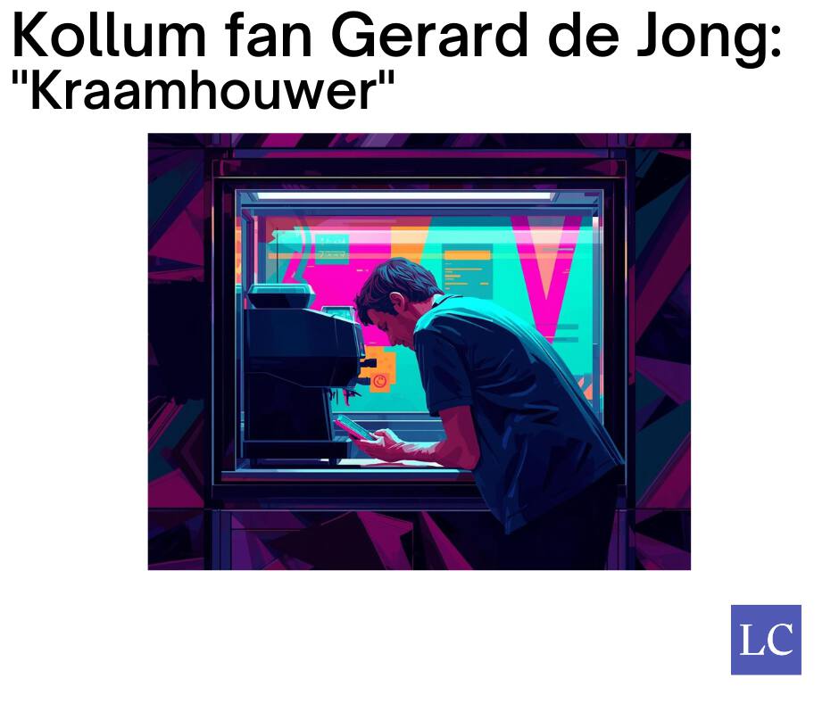 Doe’t ik ’n uur later had der’t ik foor kommen waar, liep ik fia de koffyhanneler werom. De kruk waar leeg, d’r waar gyneen meer: de kraam ’n stuurloas skip, der’t de kaptain út ellinde fan ôfsprongen waar. Ik waar hest bij de útgang, doe’t ik de koffyhanneler sitten sâg. Bij ’t eet- en drinktintsy, tillefoan in de hând, ’n der bestelde ingewikkelde hipsterkoffy foor syn neus.